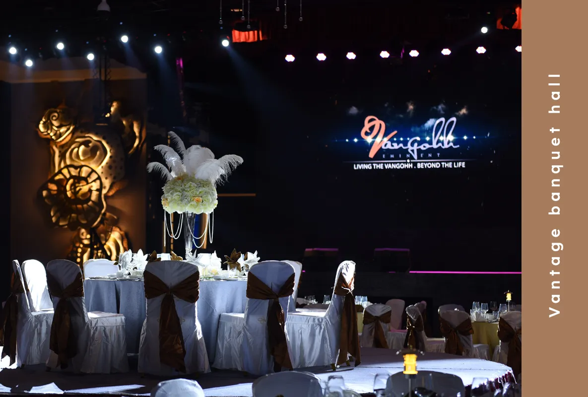 Vantage features three interconnecting banquet rooms that can comfortably accommodate thousands of guests. With a sophisticated setting, dedicated make-up room, versatile stage options, full audiovisual facilities, and a custom air purification system, we ensure the highest level of comfort and service. Let us make your special occasion a truly memorable experience. For an elegant and spacious venue, Vantage is where celebrations come to life.