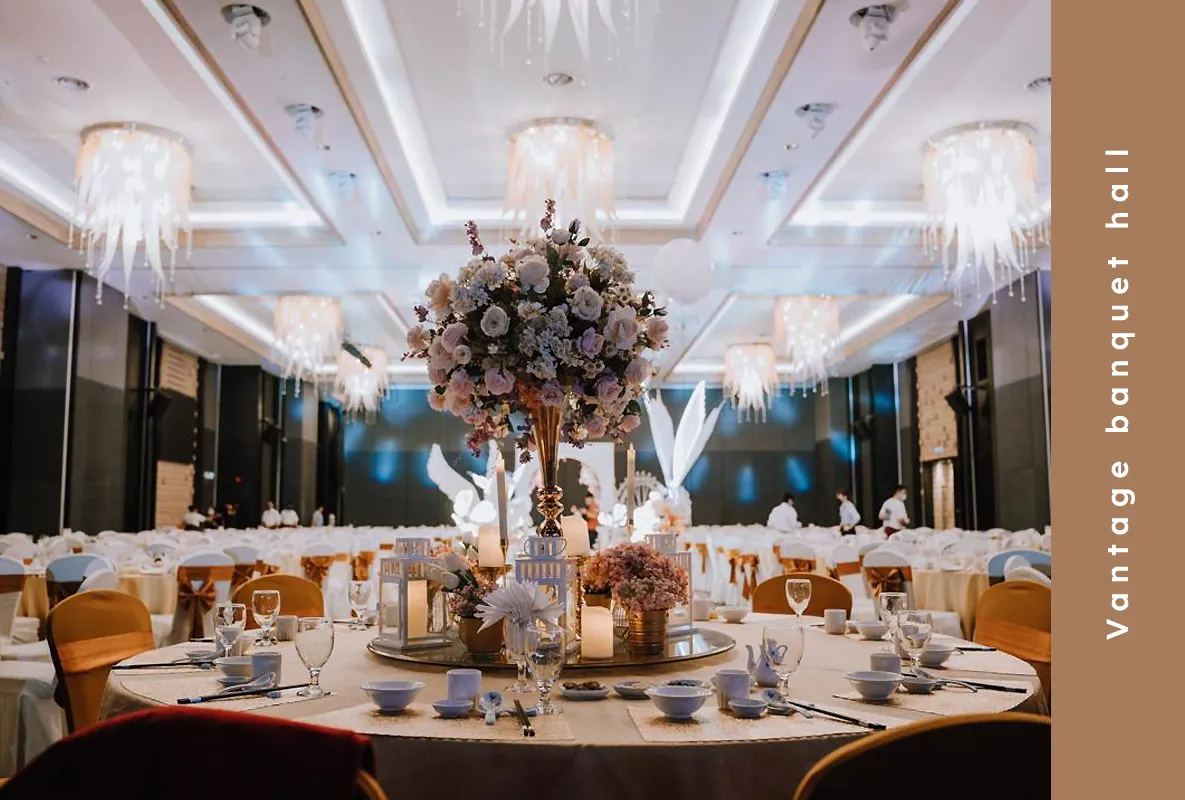 Vantage features three interconnecting banquet rooms that can comfortably accommodate thousands of guests. With a sophisticated setting, dedicated make-up room, versatile stage options, full audiovisual facilities, and a custom air purification system, we ensure the highest level of comfort and service. Let us make your special occasion a truly memorable experience. For an elegant and spacious venue, Vantage is where celebrations come to life.