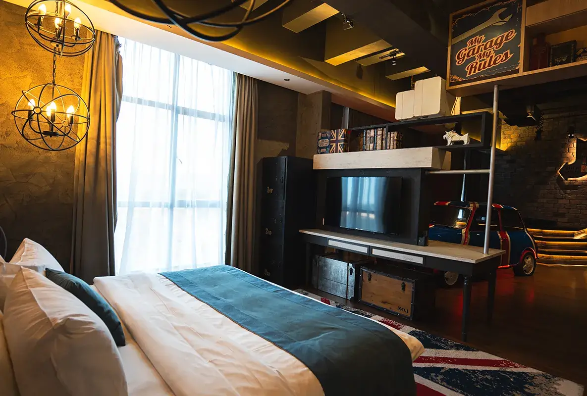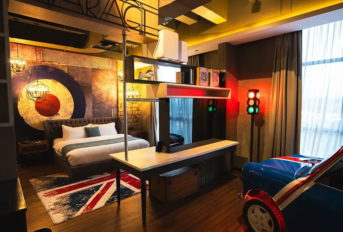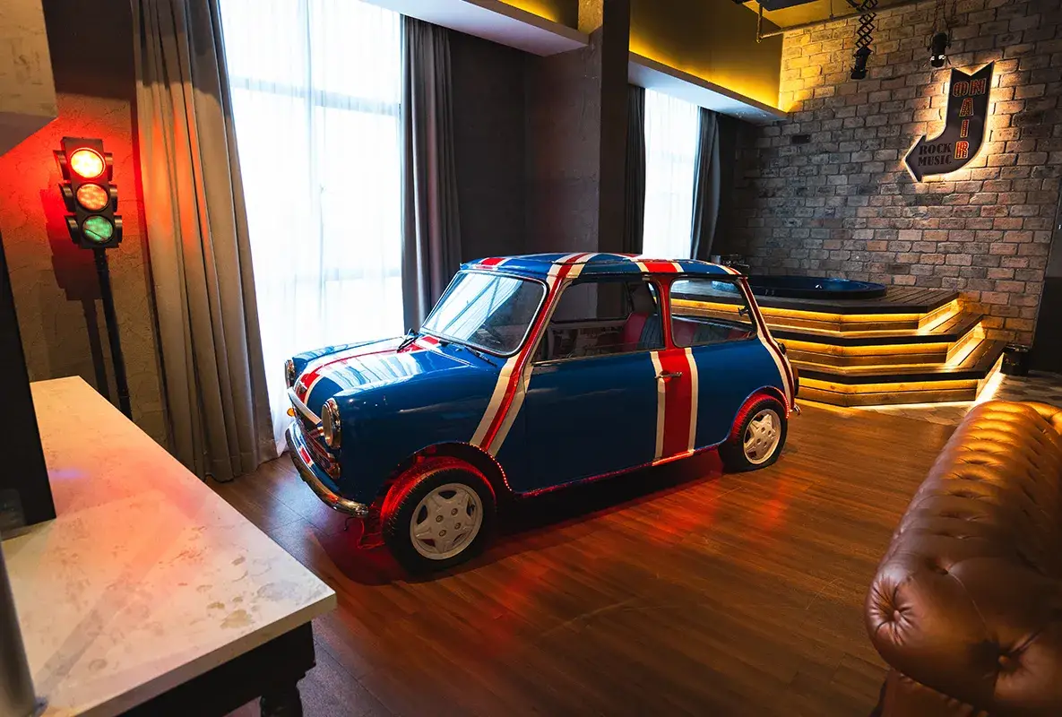Experience a truly one-of-a-kind stay in our Mini Cooper–themed boutique suite, where bold design meets playful luxury. Inspired by the iconic car celebrated for its distinctive style and spirited performance, this themed room captures the essence of the Mini Cooper — compact, charismatic, and full of personality.