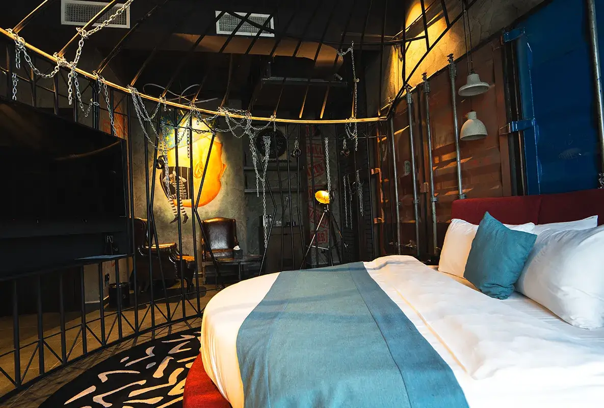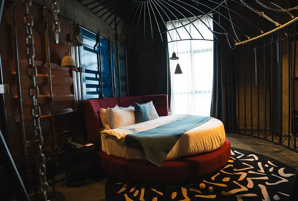 Industrial accents, minimalist furnishings, and carefully curated design elements create an atmosphere that feels authentic yet comfortable. Far from punishment, this stay offers a fun escape from routine — perfect for adventurous travelers, couples looking for something different, and guests who enjoy experiential design with a sense of humor.